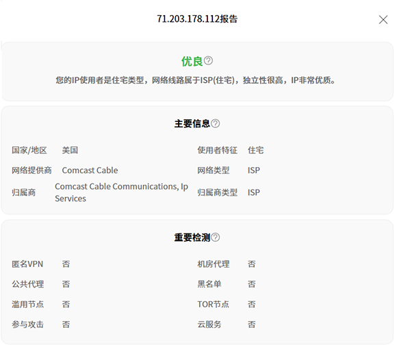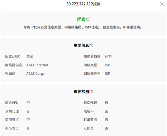 它家的静态住宅IP最低20个起卖最低$6/月,动态住宅IP最高$7/G,它家有免费的套餐,1G流量/10个代理/月,也就是说每月你有10个住宅代理IP和1G的流量可以免费使用,免费的代理ip,可以直接在小火箭,V2ray上用socks5连接,速度还不错,看youtube都可以,注意这个免费的不是住宅代理,是机房IP。同时也有动态住宅IP出售,流量也是时间限制,相当于是按月按流量收费。静态住宅IP根据IP质量来分有3种,分别是Shared Proxy(多人共享)、Private Proxy(1-2人共享)和Dedicated Proxy(独享),又有不同流量可以选,Individual Replacements就是免费替换次数,因为有的ip可能通过检测有问题,这时你需要替换,默认是10次替换,建议买50次,价格只增加$0.6,网站售后有邮件和工单支持。做Tiktok选Dedicated Proxy静态住宅IP。下图是Webshare的美国住宅IP的测试图。